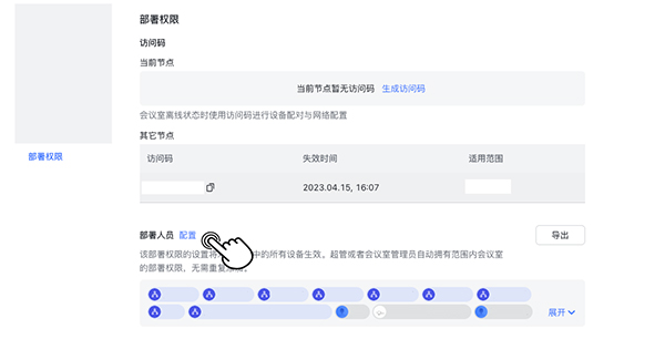 管理员可根据部署需要,选择为部署人员添加长期部署权限,或者生成访问码用于临时部署。在管理后台进入对应会议室详情页,点击 部署权限 > 配置 添加部署人员。了解详细部署流程,请查阅:配置会议室部署权限
