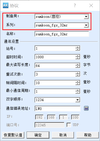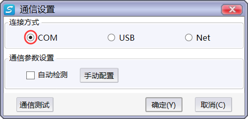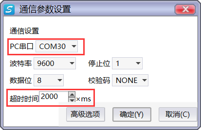 点击进行通信设置(在下载页面同样可以进行通信设置)。勾选COM连接方式,选择对应通信串口COM30口后进行通信测试。如果网络情况不好->PLC串口设置,适当调整超时时间。