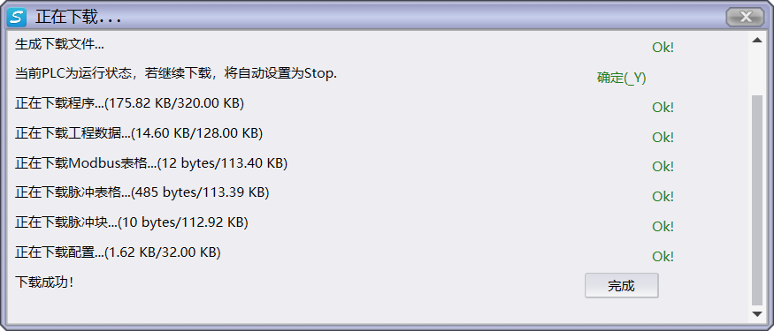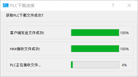 下载成功表示工程已被下载至HMI,点击完成后会由HMI自动传至PLC并出现上右图中的下载进度。