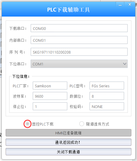 使用显控串口线连接PLC和显控SK屏。启动RemoteTool选择对应屏幕设备项的PLC下载,若要下载选择隧道透传方式,若要上载或者监控选择“显控PLC下载。
