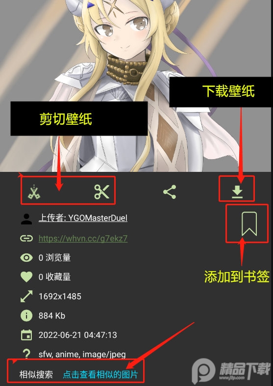 在首页图片列表中,我们点开一张壁纸图片,就能进入图片的详情页面,在这个页面可以显示图片的一切信息,我们也可以对图片进行更多的操作: