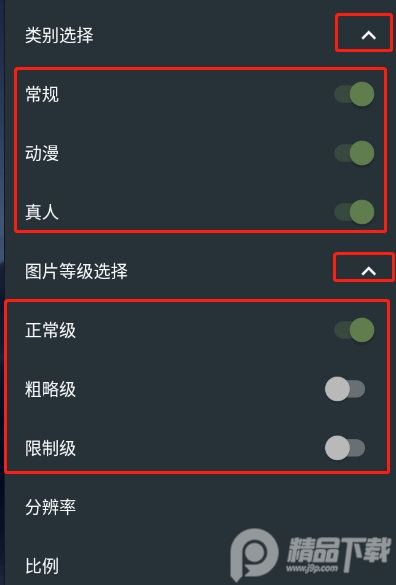 依然是点击“折叠图标”,进行类别和图片等级的选择: