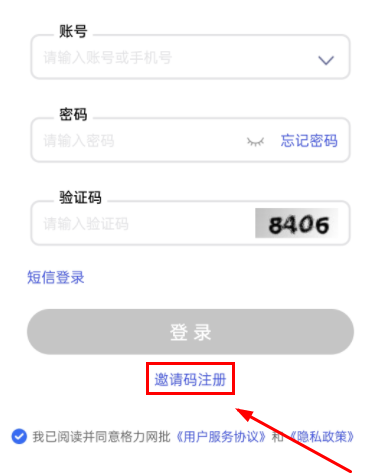 2、没有注册过的用户无法登录,短信登录也不行,必须先去“邀请码注册”。