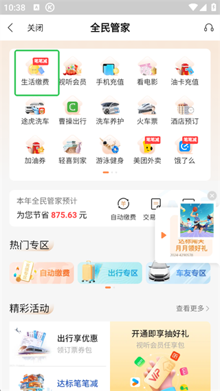 最便捷的生活服务:影票饭票优惠购,话费流量轻松充,机酒火车便捷订,公交卡充值,加油卡充值,ETC办理服务,统统可以,周边娱乐轻松找寻,网球场快捷预订什么都有;