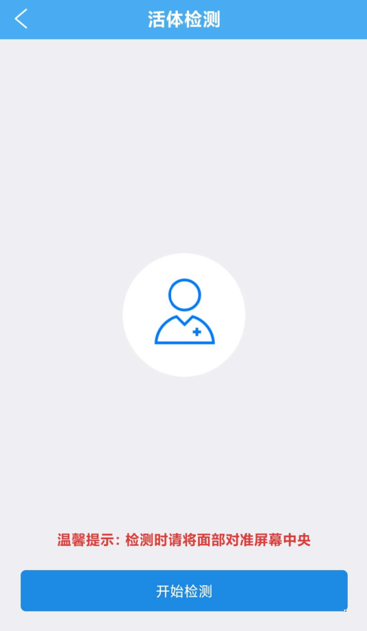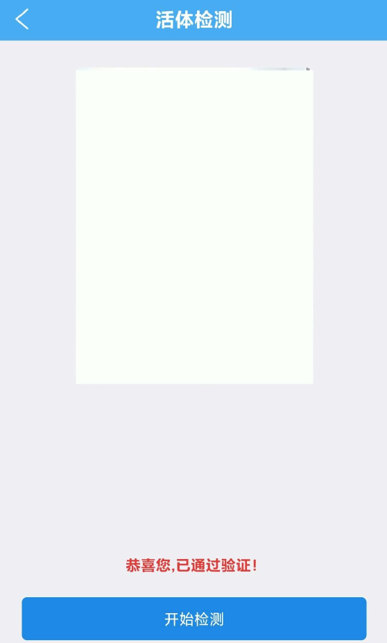 4、点击“开始检测”,将脸放到手机屏幕中出现的圈中,软件进行人脸比对。成功,下方会出现“恭喜您,已通过验证”。