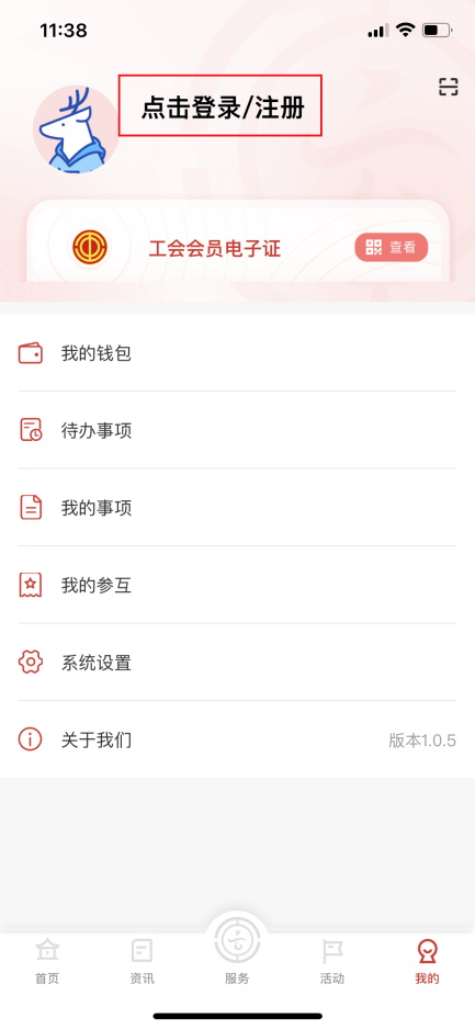 2.在我的界面点击“点击登录/注册”,如图所示,进入注册登录界面。