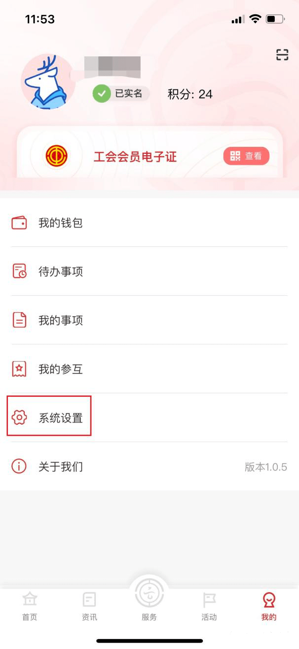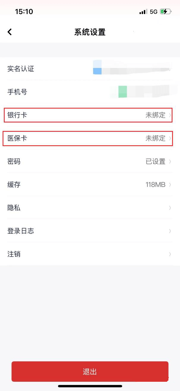 5.实名认证完成后,点击“系统设置”,绑定本人银行卡、医保卡,如图所示。