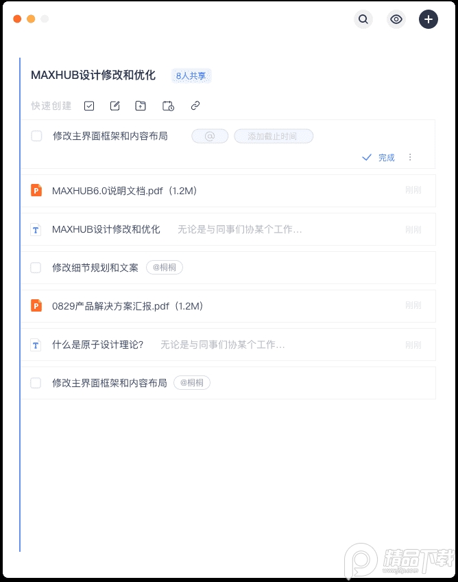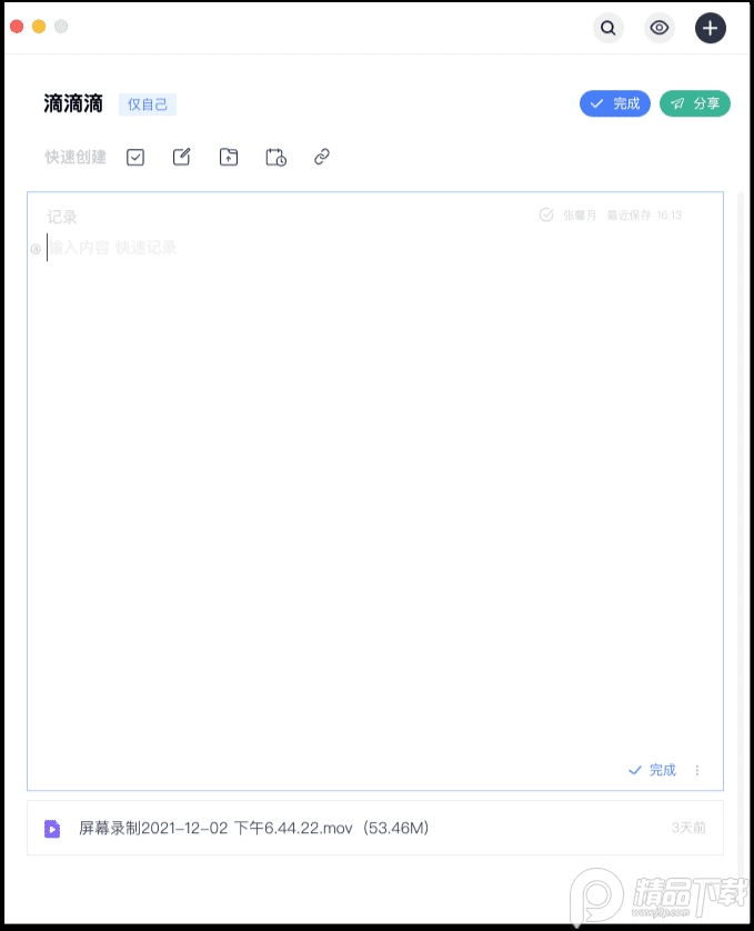 创建一个沟通记录主题后,可以通过拖拽或者点击上传的形式共享文件,或者点击【链接】按钮,共享常用在线文档或网页链接。 也可以点击【任务】工具,创建工作待办事项,并可以指定负责人员以及任务截止时间。减少口头任务分布,所带来的任务跟进记忆负担,以及任务负责人不明晰导致的工作无法如期完成的情况。