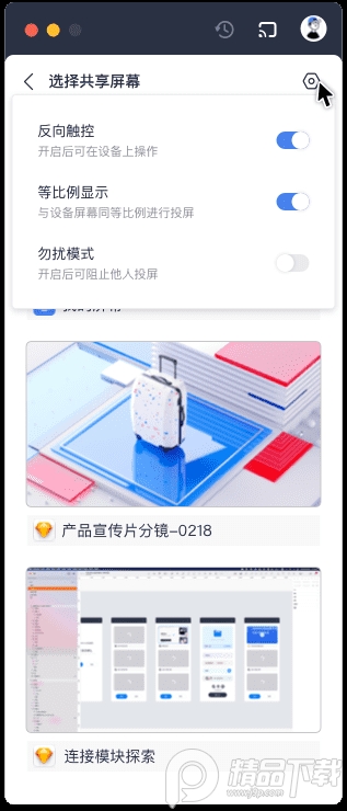在【设置】中进行【等比例显示】、【勿扰模式】、【反向触控】等投屏设置项选择。