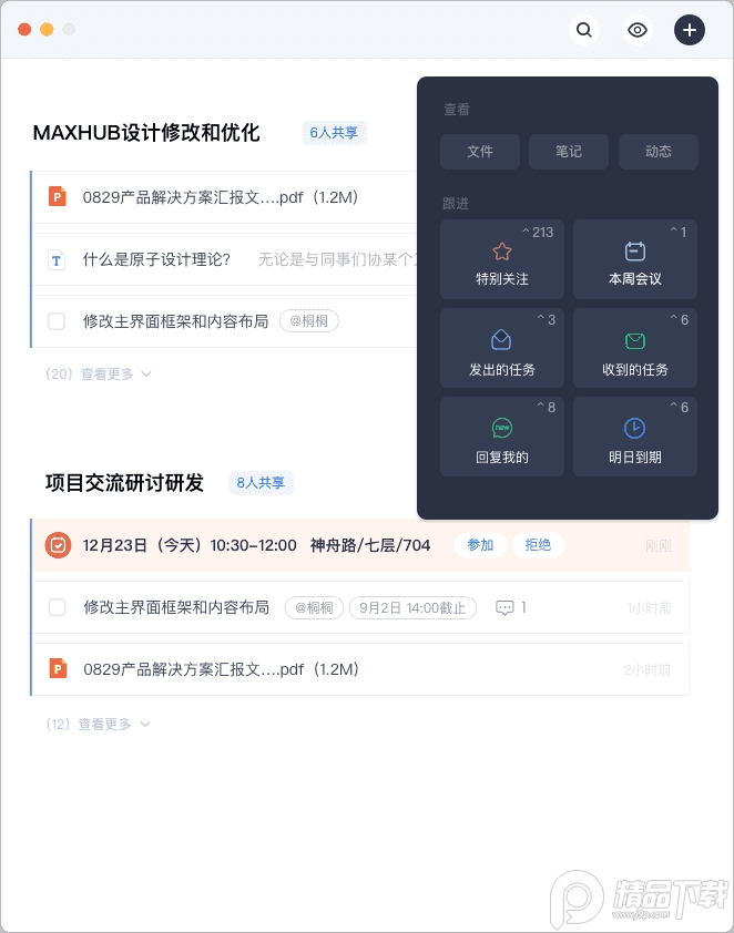 5、团队沟通工具,基于会议内容创建任务、记录笔记、上传文件、预约会议,可从不同维度追踪所需内容。