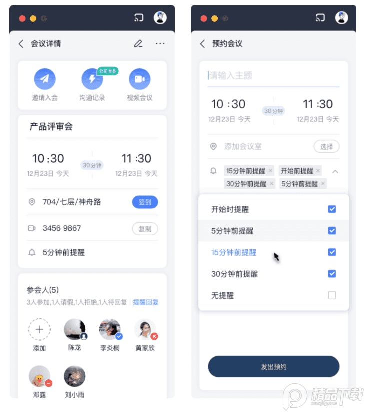点击【预约会议】小工具,即可查看当前会议日程。点击预约会议,即可预约会议、预定会议室及邀请目标参会人,也可以设置会前提醒,避免会议遗漏。