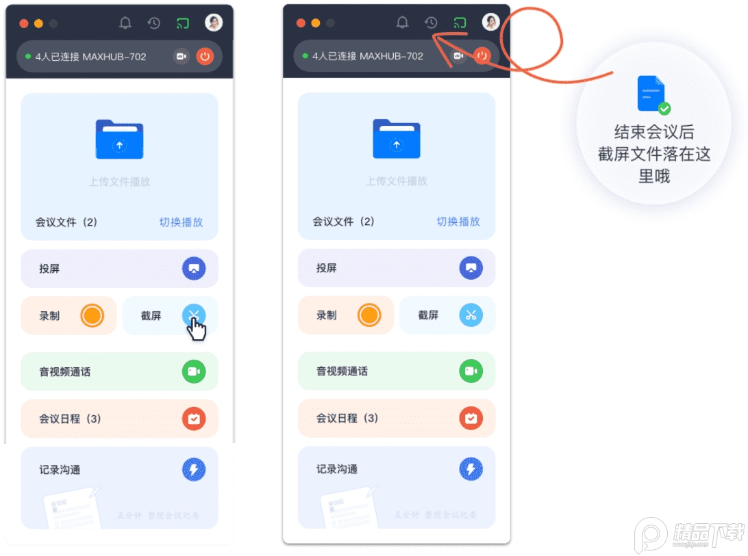 在连接状态中,点击【截屏】工具,即可将MAXHUB会议平板上批注内容、讨论资料,以截图形式获取,并保留在本次连接记录当中,可供获取并共享与会人。
