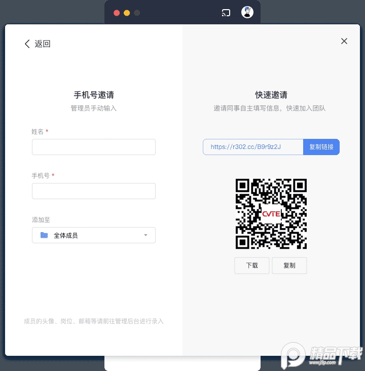 点击【个人头像】-【企业通讯录】-【邀请成员】即可复制邀请链接/二维码,进行成员邀请。