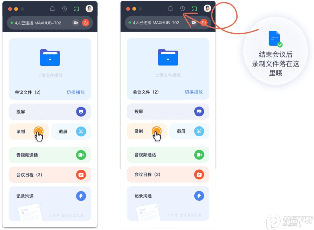 在连接状态中,点击【会议录制】,即可调用MAXHUB会议平板的麦克风进行会议过程录音,并且实时录制会议连接状态中,会议平板的画面,生成一份音视频文件保存在连接记录当中。
