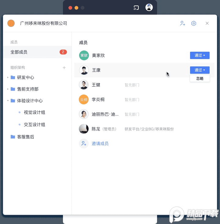 点击【个人头像】-【企业通讯录】-【全部成员】即可点击通过/忽略成员加入团队申请。
