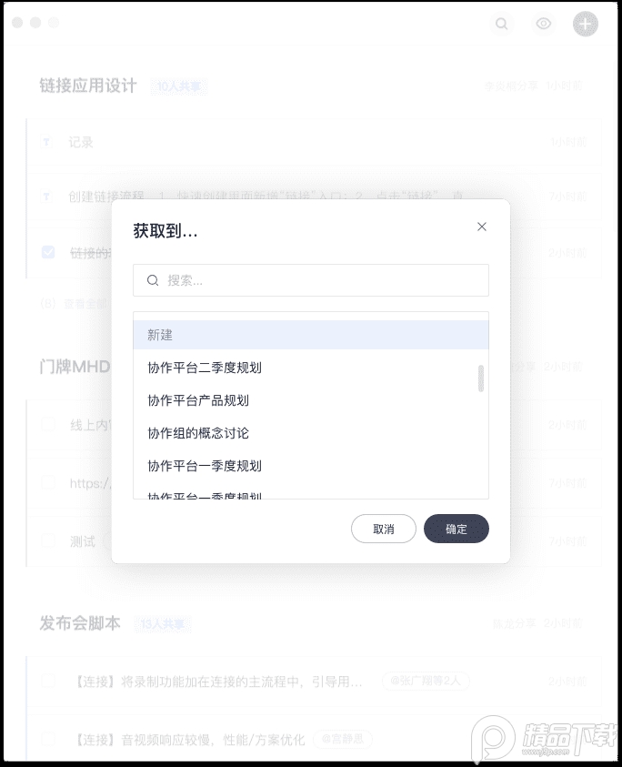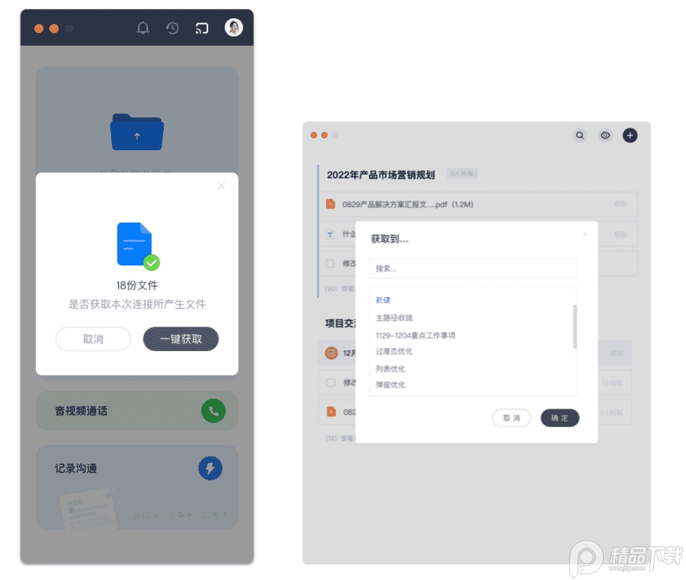 共享的文件资料将会自动收集方便归档,可通过点击对应的连接记录中的目标文件并操作一键获取,即可归档到目标沟通主题当中。
