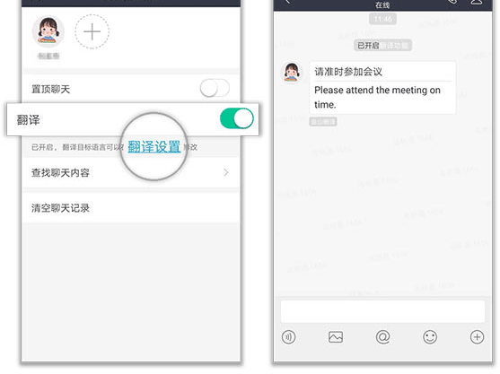 点击右上方的头像,开启翻译功能并设置好目标语言,即可实现实时翻译,沟通从此无边界!