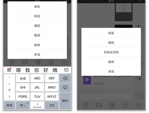 支持收发IM消息,文件,音视频等各种富媒体消息,在线播放音视频,还可随手拷贝,转发,撤回,删除,翻译文字消息,文件/音视频等消息还支持转存到云空间。