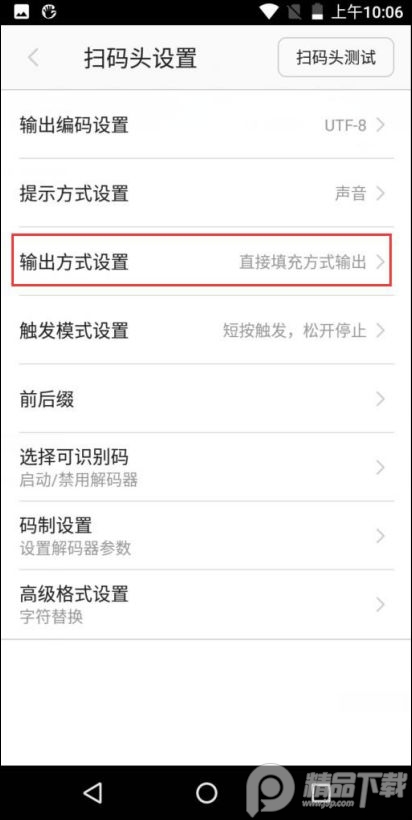 2、进入“扫码头设置”后,选择“输出方式设置”,截图如下: