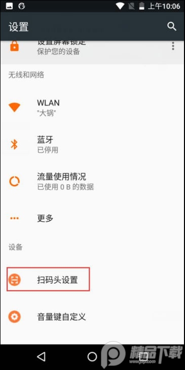 1、找到系统自带“设置”,进入“扫码头设置”,截图如下: