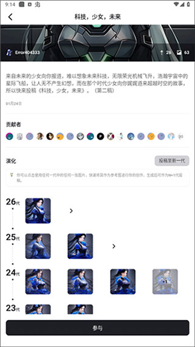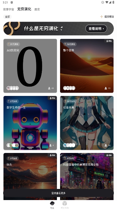 创造了无穷演化的共创玩法,你可以和其他用户一起,对图片进行创作,并看到变化是如何发生的。通过 软件提供的个人策展,你还能将你生成的图片组织成一个故事,或者系列,然后分享到社区,或你的朋友,这里可以看一个例子:https://6pen.art/exhibition/curation/7084