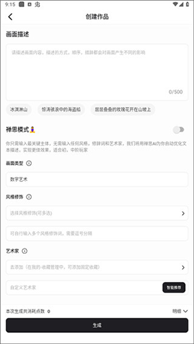 AI技术驱动:利用先进的AI技术,通过用户输入的文字描述来生成绘画作品。