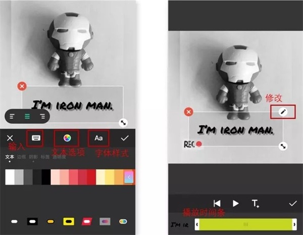 如左图所示,在「文本选项」中,可以修改文本颜色、边框、阴影、标签等,点击「打钩」符号即可完成。修改字幕的大小、位置和播放时间长度和以上修改贴纸的操作是相同的。
