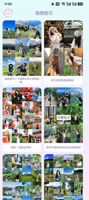 4、最后,在平台内还有超多的拍摄技巧,如果你不会摆姿势完全能来这里学习一下,轻松让照片看起来更有趣。