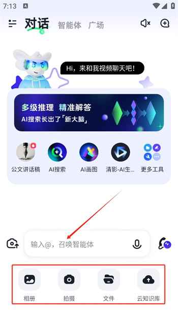 1、直接进入应用之后就可以点击下方的输入方框,在这里输入自己想要询问的问题或者是各种需求,同时还可以在下方选择相应的照片与视频,之后这个ai平台自动为你生成符合需求的结果;