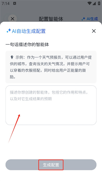 4、在这里可以为自己设计出一个贴合的智能体,方框中输入智能体相关的详细介绍,然后继续点击下方的【生成配置】,就可以自动为你ai配置出一个想象中的人工智能小助手帮助。