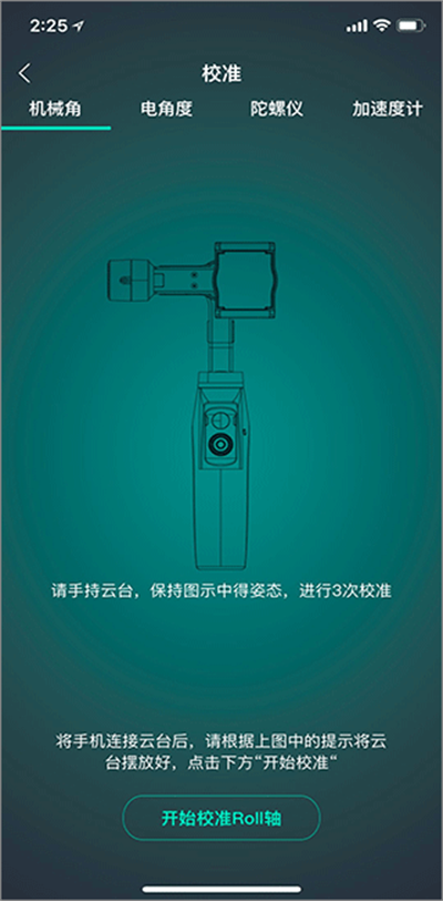 5.点击页面下方“校准”后按照图片指示说明依次进行校准,设备进入休眠状态,即可开始进行Roll轴、Pitch轴、Yaw轴3次校准,根据提示校准完成后,重新启动设备连接app即可使用。