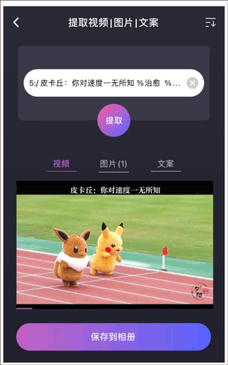 3、复制之后,再打开本款app,然后点击首页里面的提取视频|图片按钮,点击进入后,长按粘贴刚刚的链接,然后点提取就可以获取到无水印的视频/图片了。