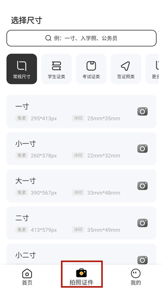 3、在拍照证件板块可以选择具体的尺寸和类型。