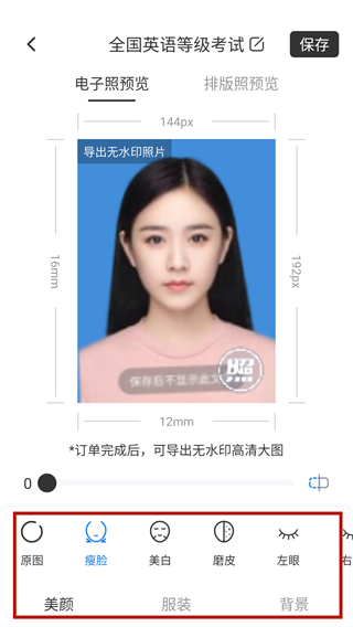 Al智能研究算法提供瘦脸、美白、磨皮、左右眼精修、美瞳、嘴巴微调等美颜功能。一键还原更美且真实的你,打造自然、高级感脸庞,告别证照不美的时代。