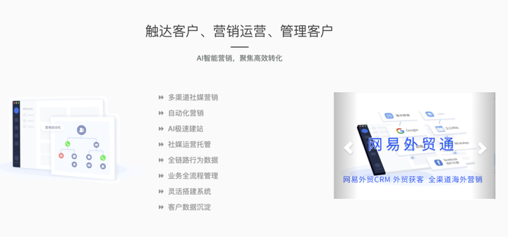 网易外贸通是网易专为外贸企业打造的一站式海外营销管理平台,助力企业多元营销、精准获客、高效协作,驱动外贸业务飞速发展。网易外贸通依托网易大数据、AI全天不停歇挖掘,智能推荐高价值潜客;基于26年邮件技术,全面提升邮件营销效率;支持社媒营销,高效触达目标客户;企业还可使用AI建站低成本快速搭建专业的外贸独立站;网易外贸通用科技赋能传统外贸,助力外贸企业精准获客。