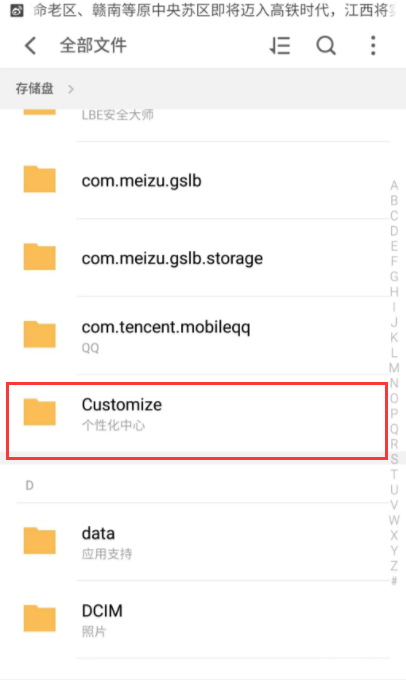 2、在文件夹的根目录找到“customize”文件夹,如下图所示,点击并打开这个文件夹。