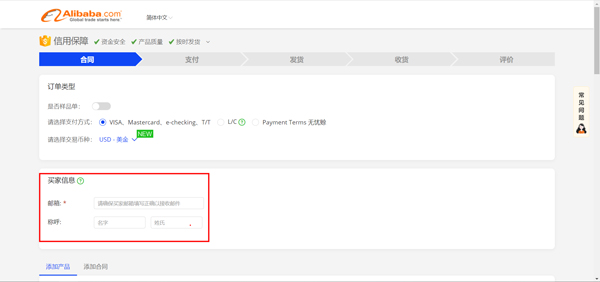 第二步:选择 是否样品单、支付方式、交易币种