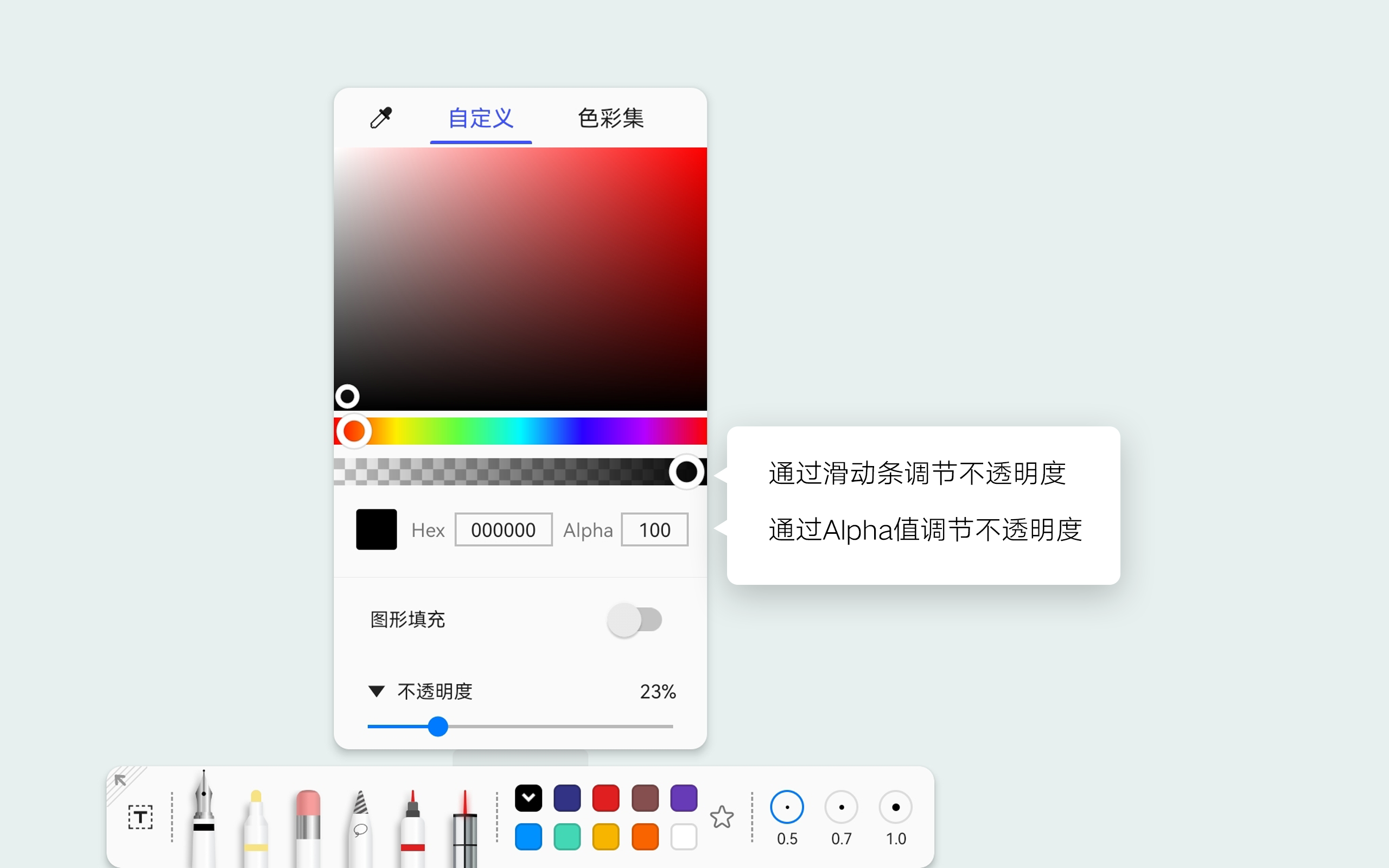如果您在笔盒颜色菜单上调节底部不透明度没有反应,是因为那个是调节图形填充不透明度的位置,如果您需要调节笔刷颜色的不透明度需要通过上部分滑动条或输入修改Alpha值来调整。