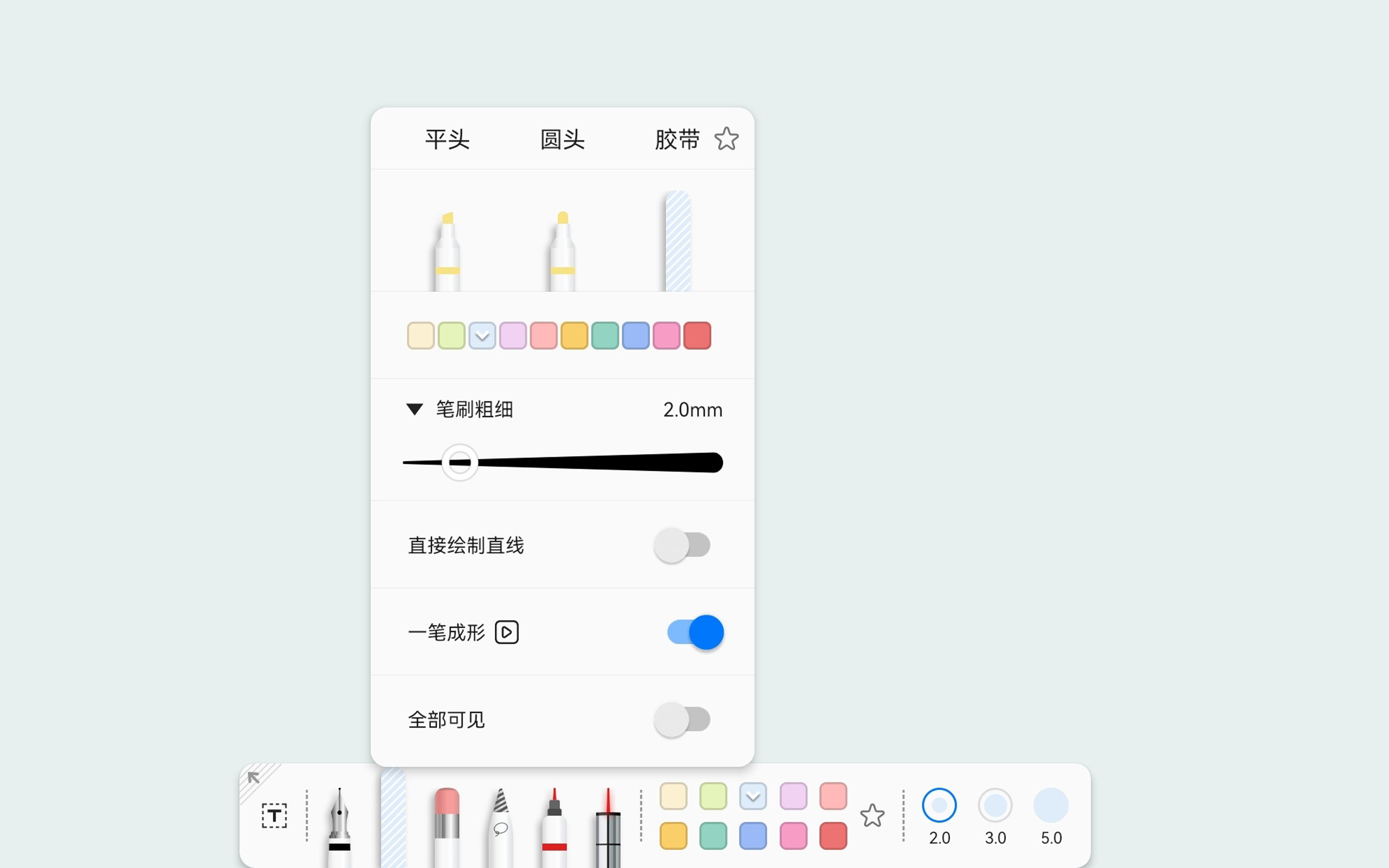 一个灵活百变的独特笔盒,可以随意拖拽和收起。每只笔单独预设对应的颜色与笔刷粗细,每本文档单独保存专属笔盒!当然,如果想把笔盒设置为全局,也没问题。