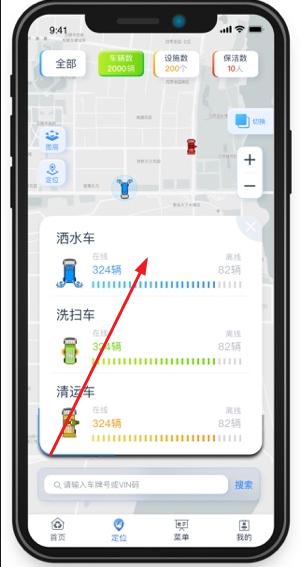 2、在首页最下面的定位板块,可以让你找到洒水车,洗扫车的工作状态;