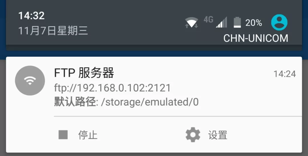 这时候FTP服务器已经启动,下拉展开通知栏即可看见地址,地址下面是默认分享路径,在这里点击“设置”可以进行默认分享路径、用户名、密码与端口的设置。