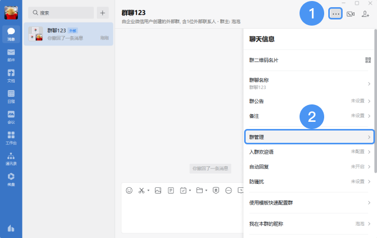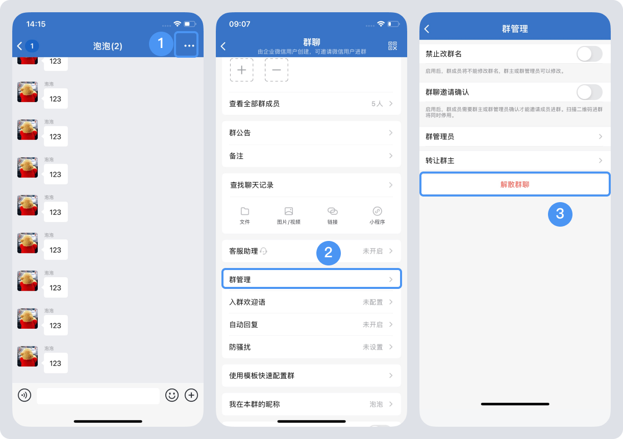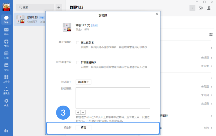 注:全员群、部门群、群主是员工服务人员的群聊暂不支持解散。